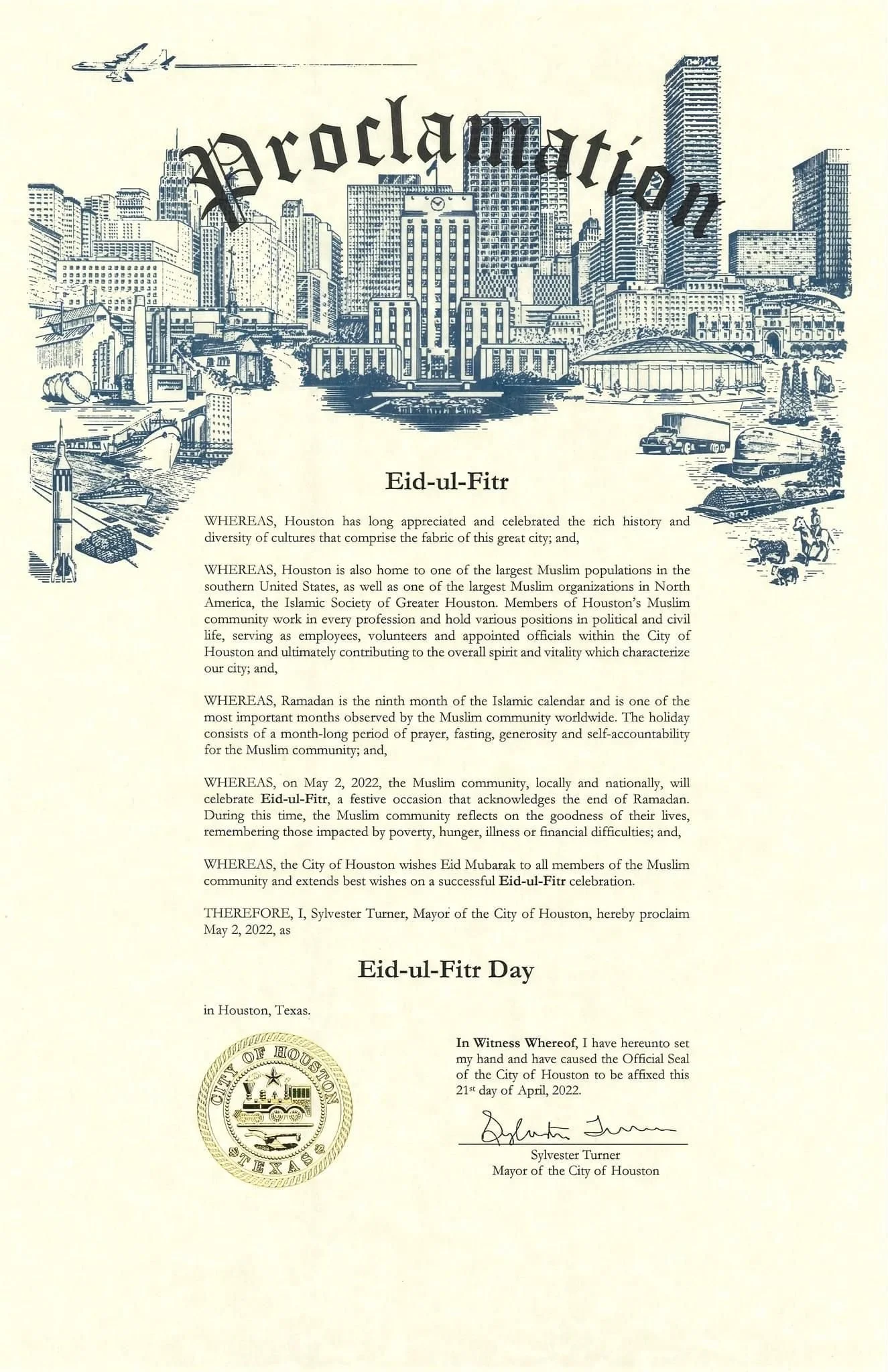 POR CUANTO, la Ciudad de Houston desea Eid Mubarak a todos los miembros de la comunidad musulmana y extiende sus mejores deseos en una exitosa celebración de Eid-ul-Fitr