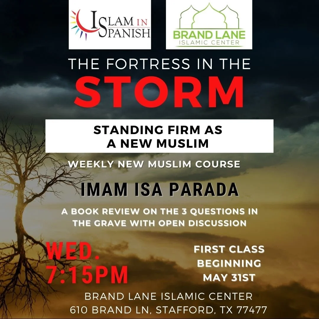 New Muslim Course on Wednesdays at 7:15pm/cst titled "The Fortress in the Storm" lead by Imam Isa Parada, the first American of Latino descent to graduate from the University of Medina. We are collaborating with Brand Lane Islamic Center (Masjid As-Sabireen) to bring you this interactive program.