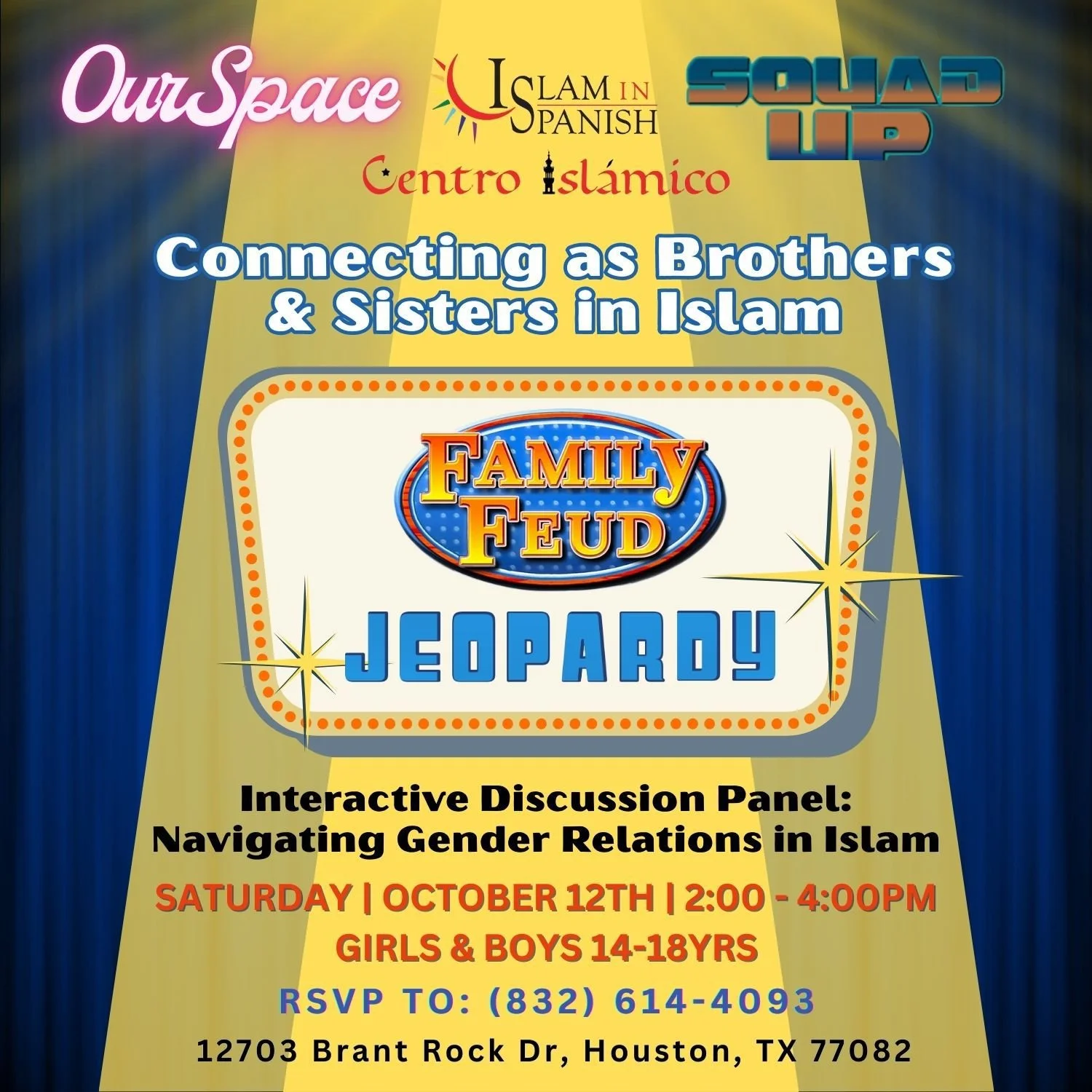 Join us for an afternoon of fun games, engaging discussion, and meaningful connections! We’ll explore how to navigate gender relations in Islam through an interactive panel and exciting rounds of Family Feud & Jeopardy.
