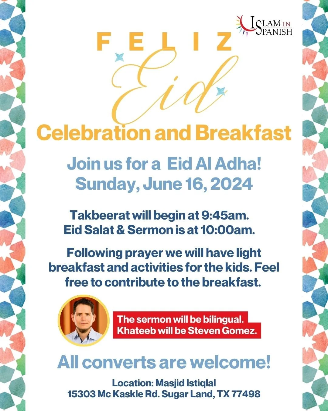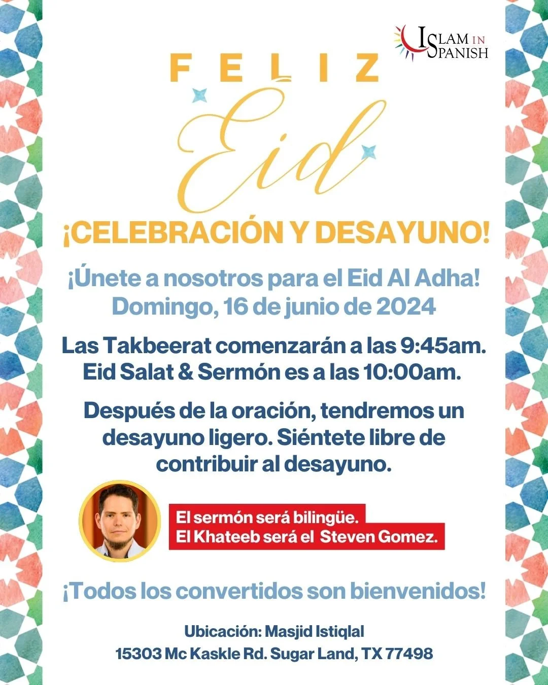 Feliz Eid Al-Adha!!! *La oración de Eid va ser domingo 16 de Junio. Empezando con las alabanzas a Dios a las 9:45AM Y la oración a las 10:00AM* en Masjid Istiqlal 15303 Mc Kaskle Rd Sugar Land, TX 77498