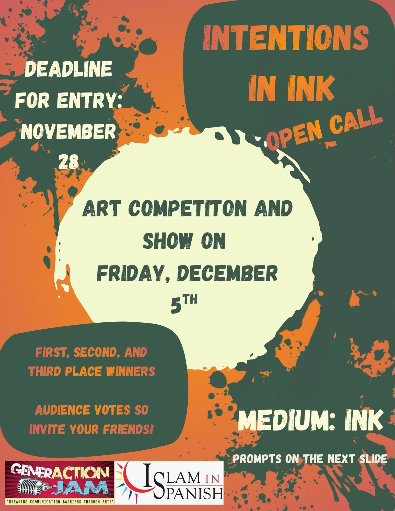 Please fill out a form for each piece of artwork you intend to submit. You may submit up to two pieces, but only one piece will be allowed to participate per artist. While entry is free, we ask of artists that sell artwork to donate 10% of profits to IslamInSpanish so that we may continue to provide a platform for young artists' voices at Generaction Jam.