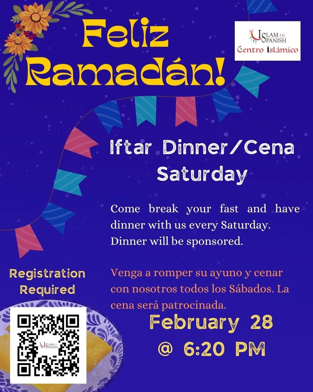 Le invitamos a usted y a su familia a acompañarnos cada sábado para romper el ayuno juntos en un ambiente cálido y acogedor. Esta es una oportunidad especial para reunirnos como comunidad, fortalecer los lazos y compartir el espíritu de gratitud y generosidad que define este mes bendito.