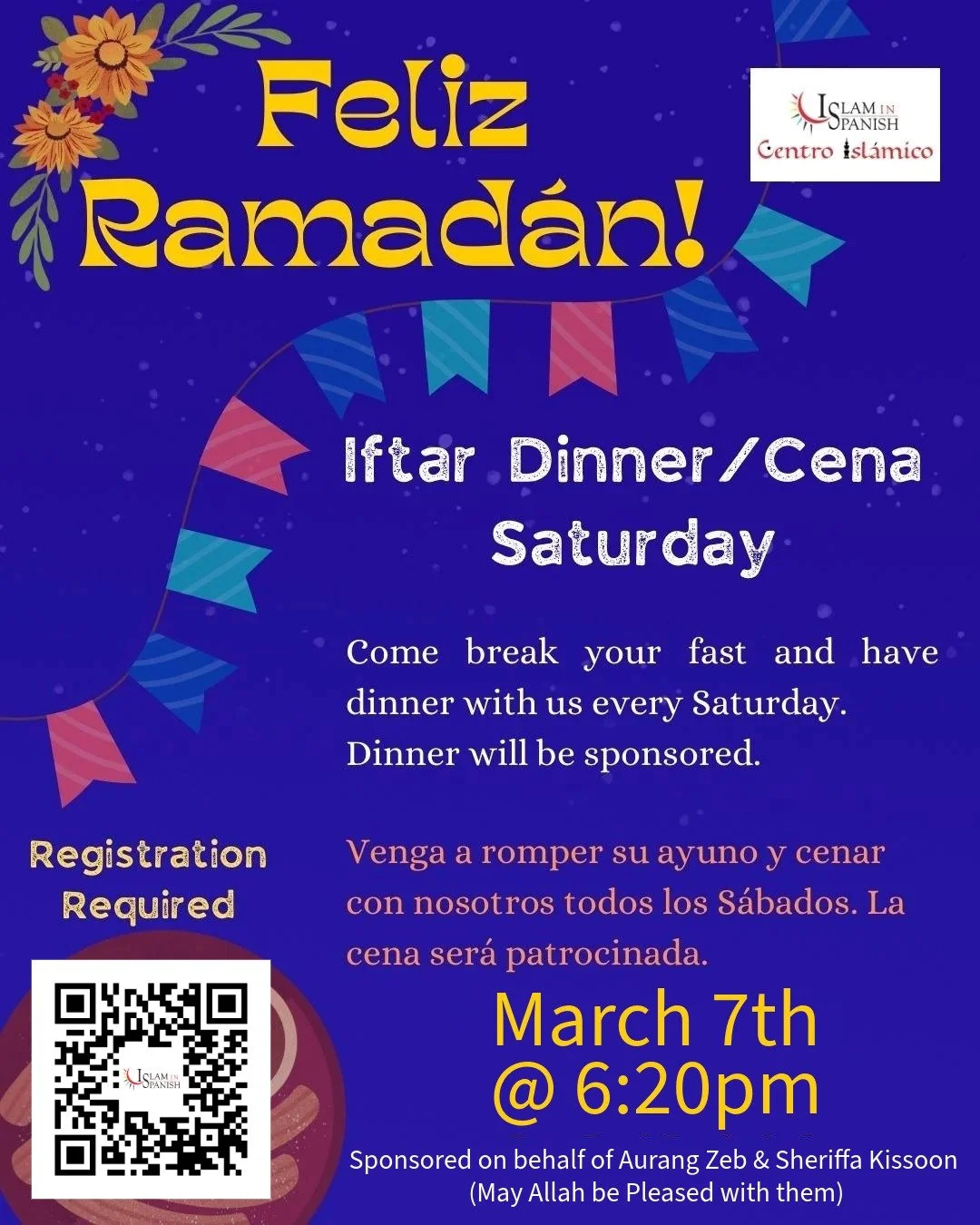 Le invitamos a usted y a su familia a acompañarnos cada sábado para romper el ayuno juntos en un ambiente cálido y acogedor. Esta es una oportunidad especial para reunirnos como comunidad, fortalecer los lazos y compartir el espíritu de gratitud y generosidad que define este mes bendito.