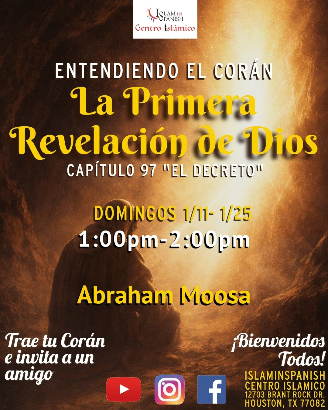 Te invitamos a una serie especial de 3 partes donde exploraremos el Capítulo 96 del Corán, Al-‘Alaq — la primera revelación que Allah descendió al Profeta Muhammad ﷺ en la cueva de Hira. Tambien el capitulo 97 “El Decreto” con Abraham Moosa.