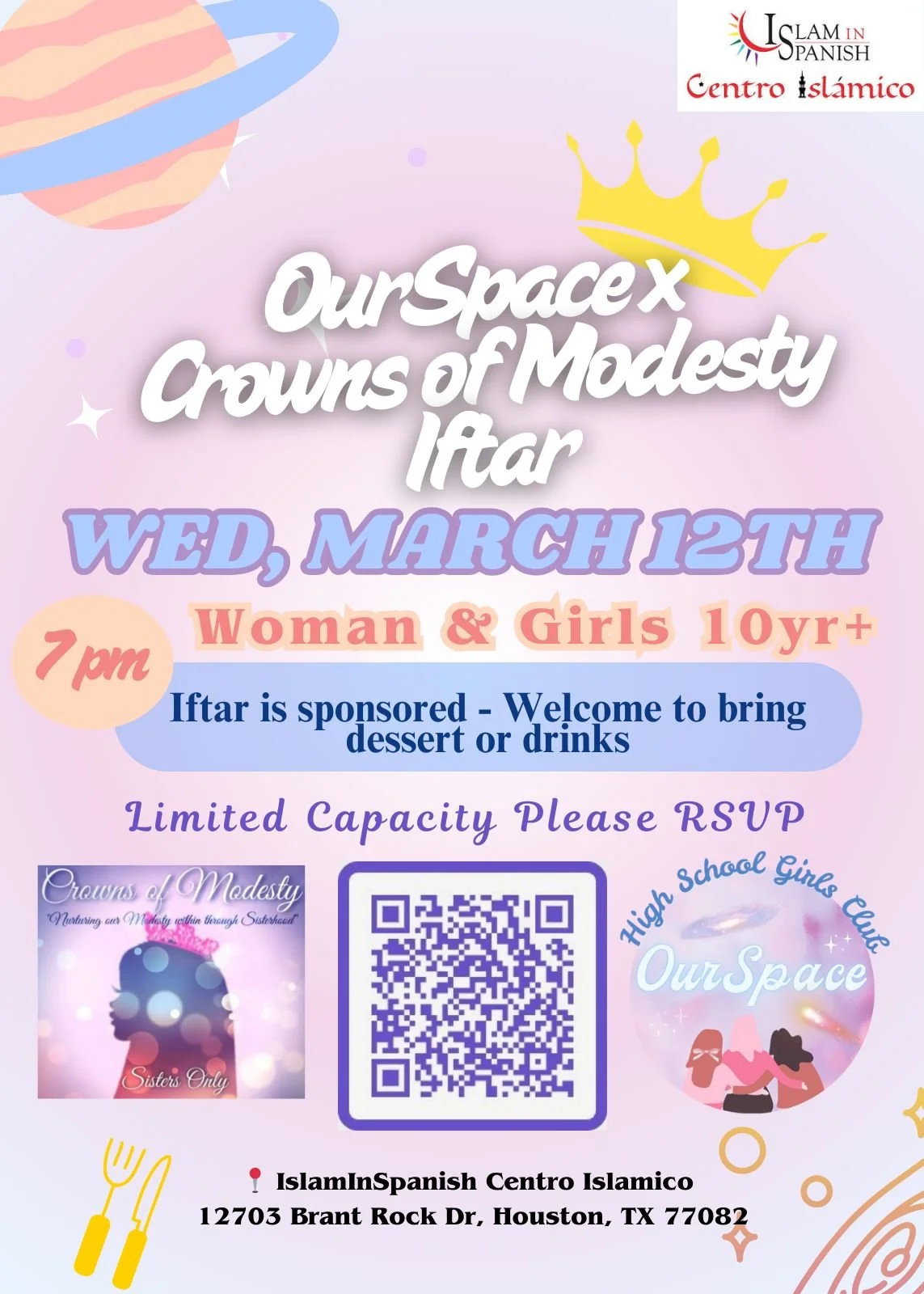 Calling all women & girls (10+) let’s come together for a beautiful evening of sisterhood, connection, and community at the OurSpace x Crowns of Modesty Iftar!