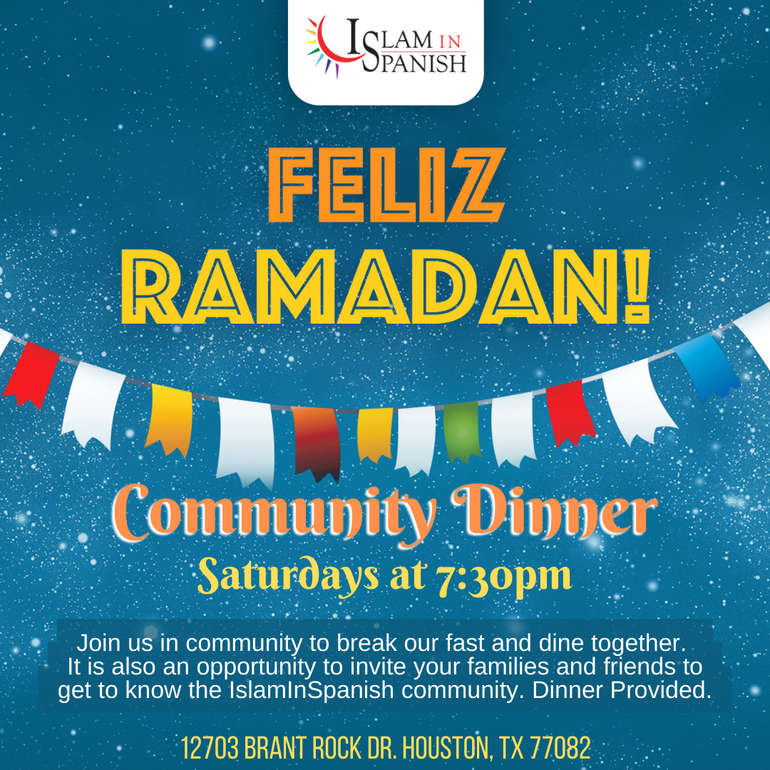¡Ramadán por fin llegó! Así que acompáñanos todos los sábados a las 7:30 p.m. para nuestro Iftar comunitario (quebrada del ayuno) y cena en el IslamInSpanish Centro Islámico.