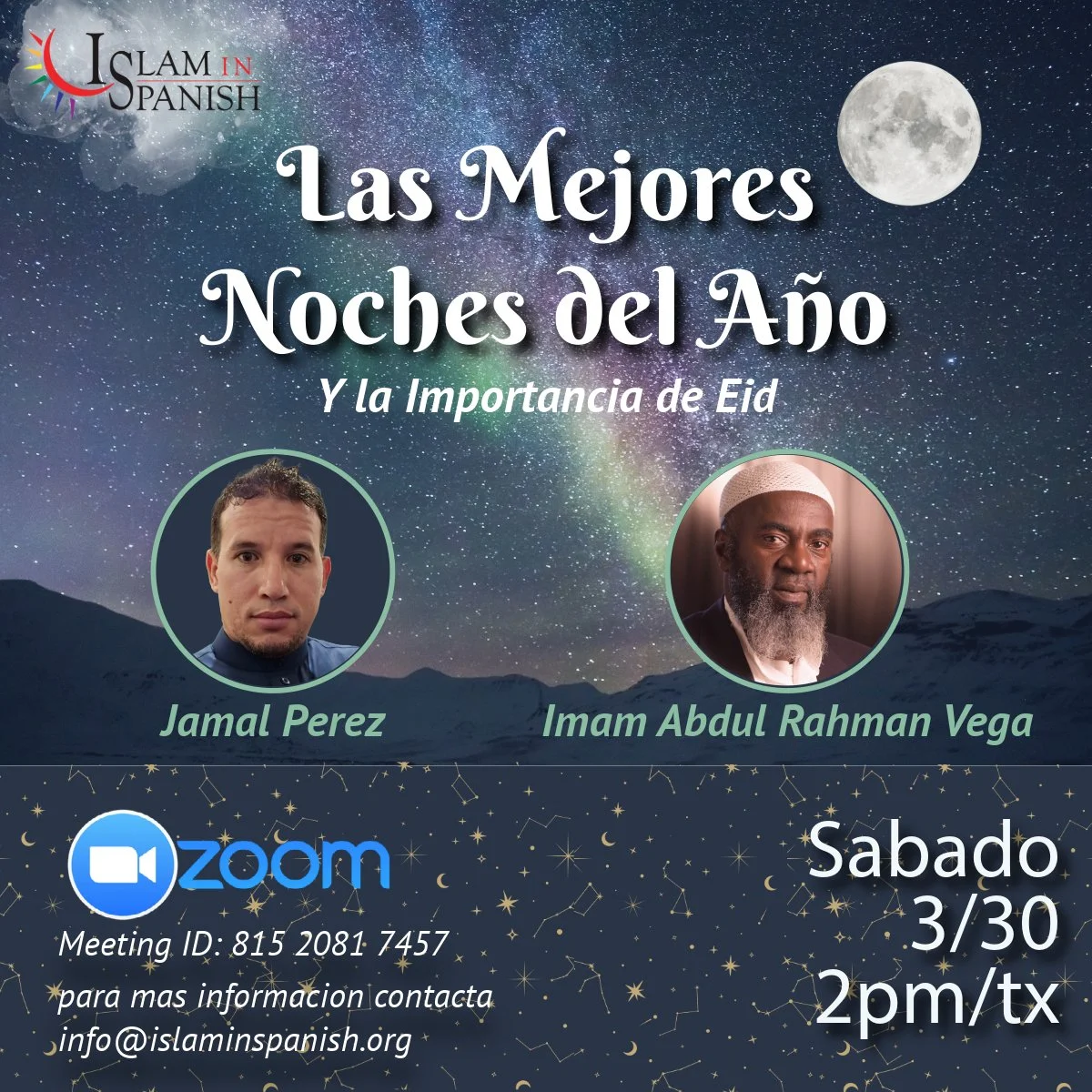En este encuentro especial a través de Zoom, liderado por Imam Abdul Rahman Vega y Jamal Perez, estaremos revelando los secretos y bendiciones de estas noches sagradas, especialmente diseñado para nuevos musulmanes que deseen comprender más sobre esta parte crucial de su fe. Acompáñanos el próximo sábado 30 de marzo a las 2 p.m. para sumergirte en la esencia espiritual y las prácticas tradicionales que hacen de las últimas 10 noches de Ramadán un período tan único y significativo.