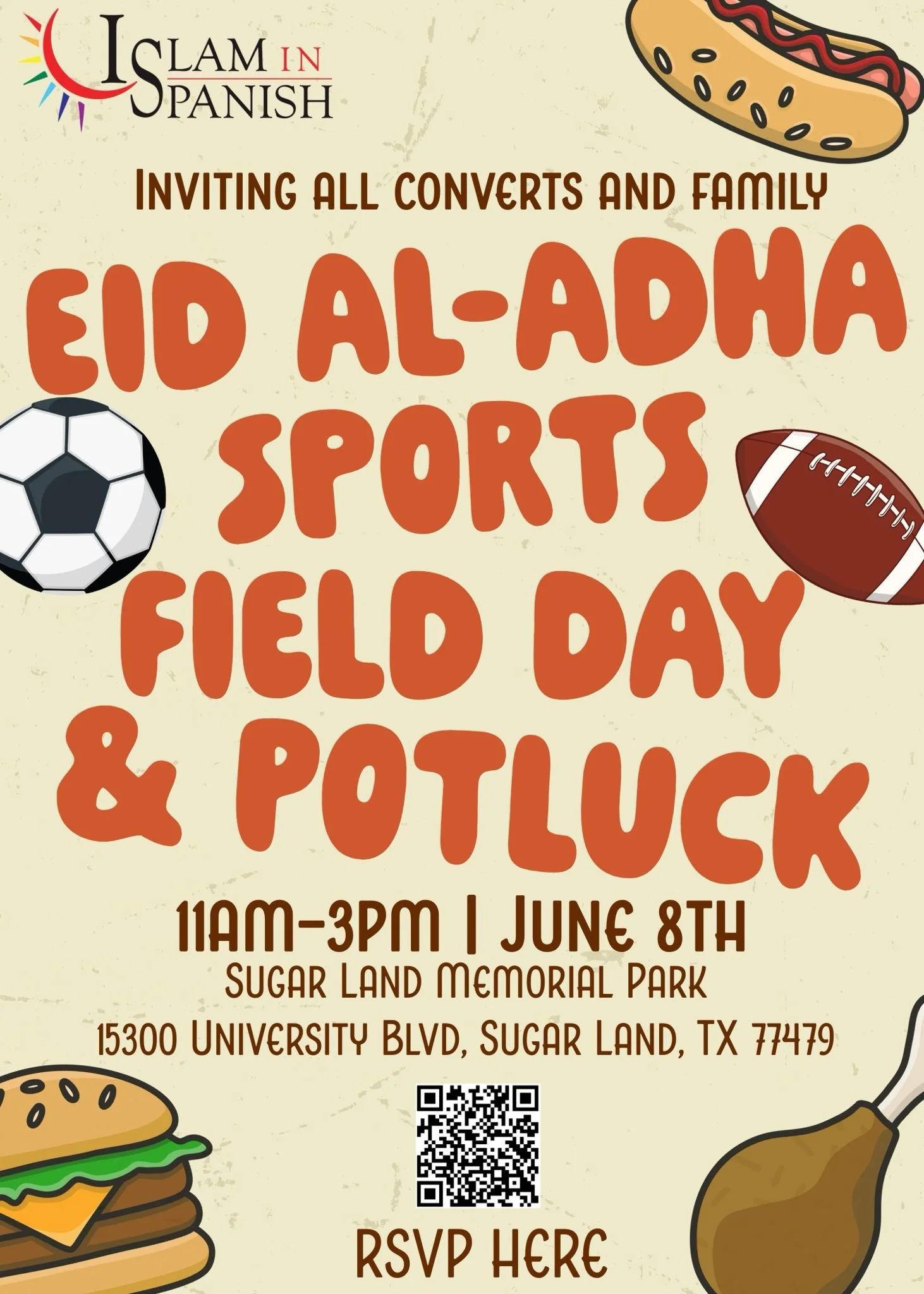 🎉 IslamInSpanish invites you to our Eid Al-Adha Sports Field Day & Potluck! 🏈