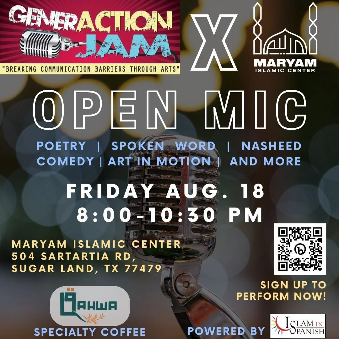 Attention Houston! The next GenerAction Jam will be in collaboration with Maryam Islamic Center this Friday, August 18th! Interested in performing, click the link below!!