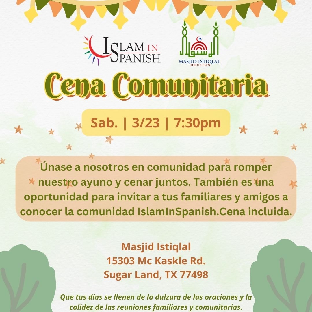 🌟 ¡Únase a nosotros este sábado 23 de marzo a las 7:30 p. m. para una conmovedora cena comunitaria organizada por IslamInSpanish en Masjid Istiqlal Houston! 🌙✨