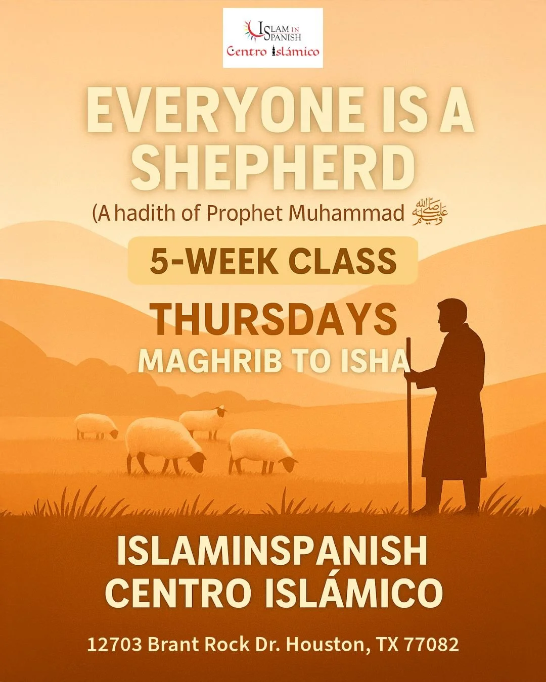 NEW CLASS SERIES STARTING THURSDAY! Join us at IslamInSpanish Centro Islámico for a 5-week course based on the powerful Hadith of the Prophet Muhammad (ﷺ): “Each of you is a shepherd, and each of you is responsible for his flock.”