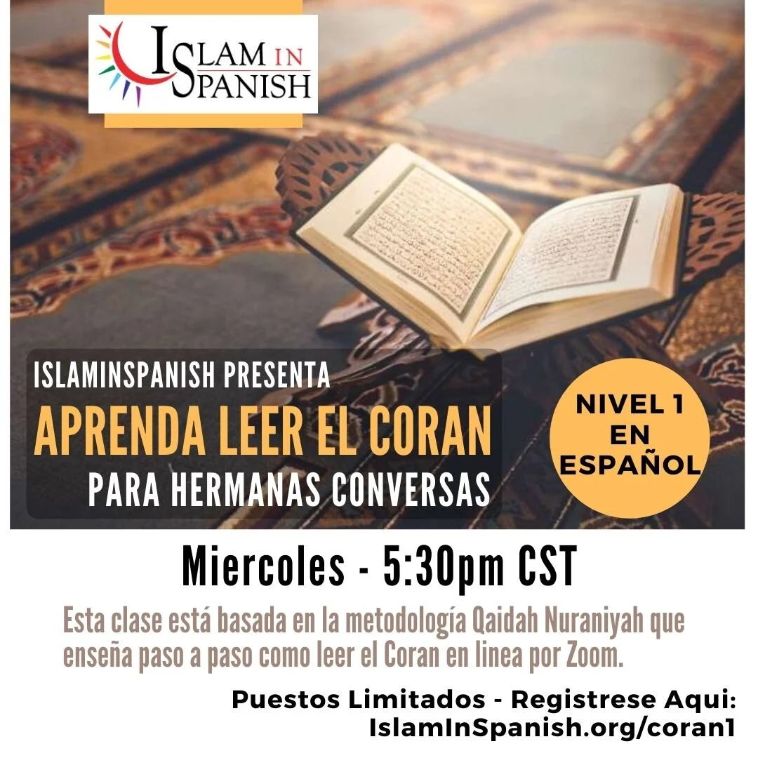 Esta clase, empezando Jueves el 9 de Junio a las 5:30pm CST, está basada en la metodología Qaidah Nuraniyah que enseña paso a paso cómo leer el Corán. Se enfoca en comprender el punto de articulación de las letras (makhraj) y enseña un nivel básico de la forma de recitar el Corán (tajweed) y las Características de las letras (siffat) necesarios para poder leer correctamente el Corán.