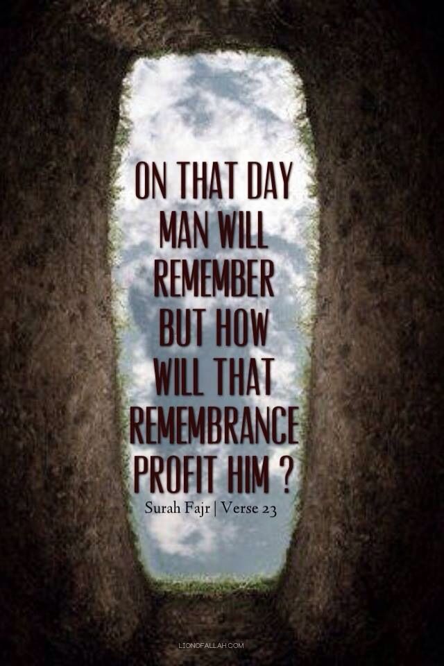 That one day, we will be in the grave, lying upon the dirt covered floor, covered in worms, being questioned by Munkar and Nakir, and awakened to be question by the Sublime, thereafter entered into the destination that we have earned through our actions in this world, paradise or hell. We need to prepare for the reality of this day.