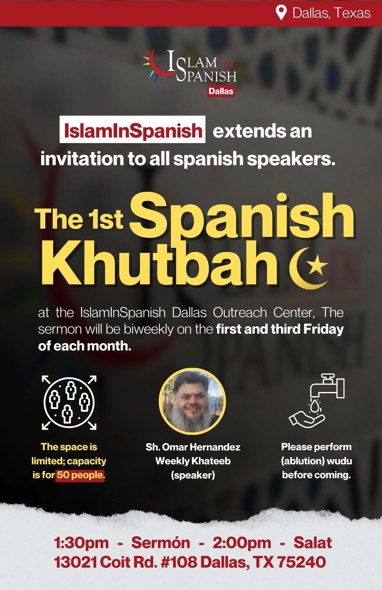 Come and join our Jummuah (sermon) at our IslamInSpanish Dallas Outreach Center every Friday during Ramadan, featuring Sheikh Omar Hernández, a Latino graduate from Medina University as our speaker/khateeb. 🕌