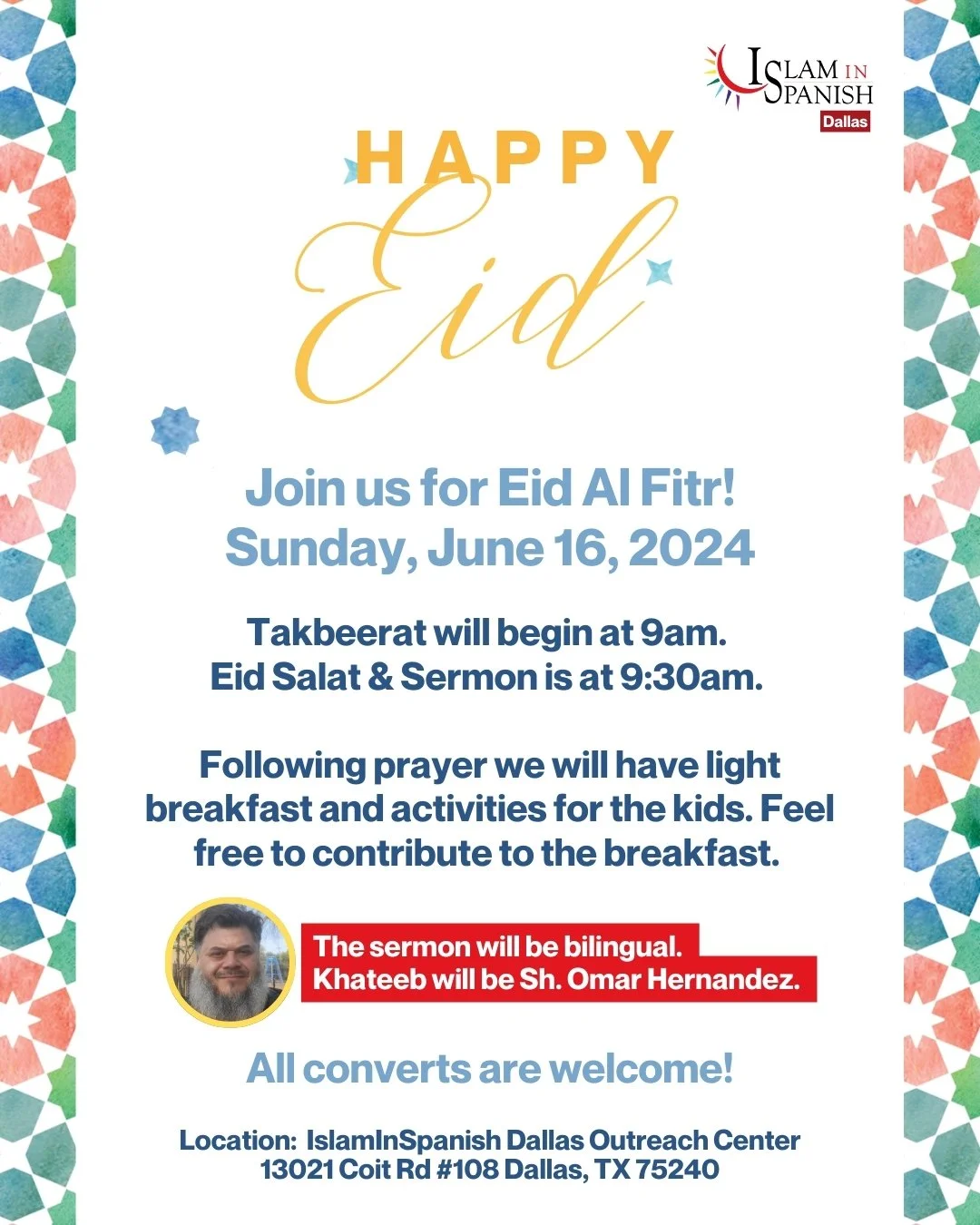 Feliz Eid Al-Adha!!! La oración de Eid va ser domingo 16 de Junio. Empezando con las alabanzas a Dios a las 9:00AM Y la oración a las 9:30AM en IslamInSpanish Dallas Outreach Center 13021 Coit Rd. #108 Dallas, TX 75240