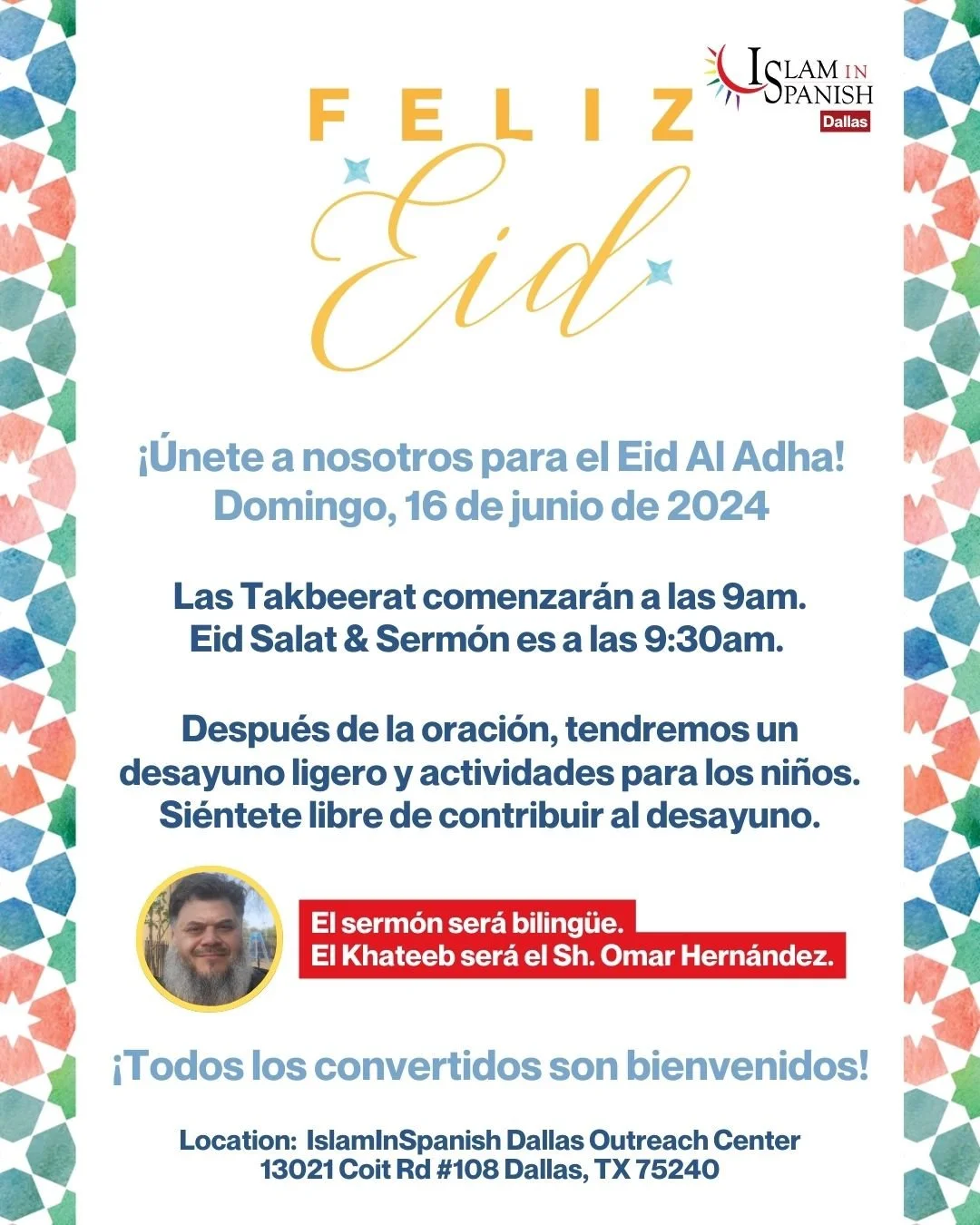 Eid Al-Adha Mubarak!!! The Eid prayer will be Sunday, June 16. Starting with praises to Allah (Takbirat) at 9:00AM And prayer at 9:30AM at IslamInSpanish Dallas Outreach Center 13021 Coit Rd. #108 Dallas, TX 75240