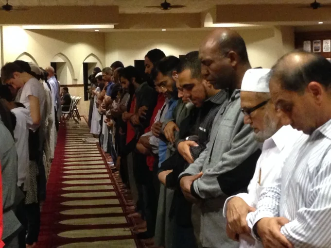 Evening prayers at the Maryam Mosque in Sugar Land Texas. Jaime Mujahid Fletcher is fourth from the right. Credit: Jason Margolis