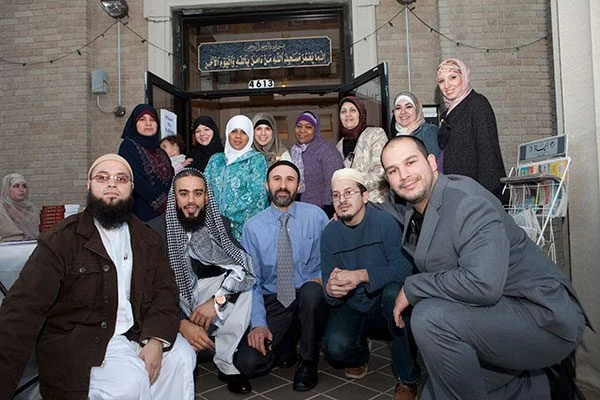 Members of the Center, a Sunni Mosque, gather on Hispanic Muslim Day at the entrance to the building. Photo by Christopher Lane.