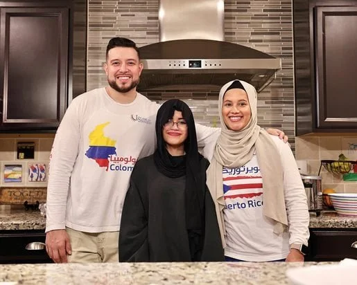 Alex and Eveliz Gutierrez, joined by their daughter, show off their homeland pride via their bilingual IslamInSpanish shirts.